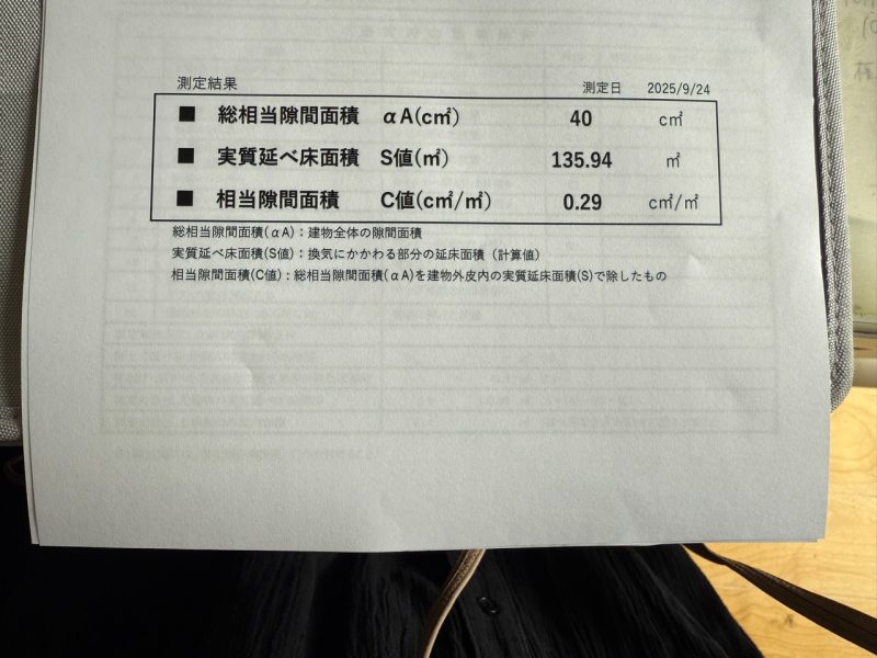 さて、先日の現在建築中の平屋のお家の気密測定結果↓